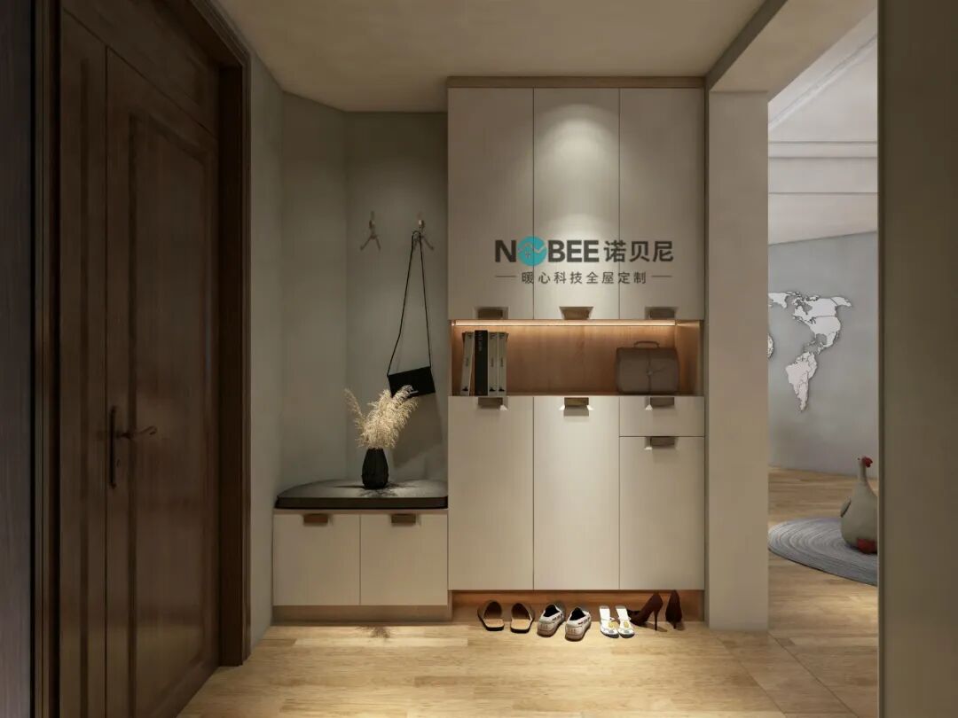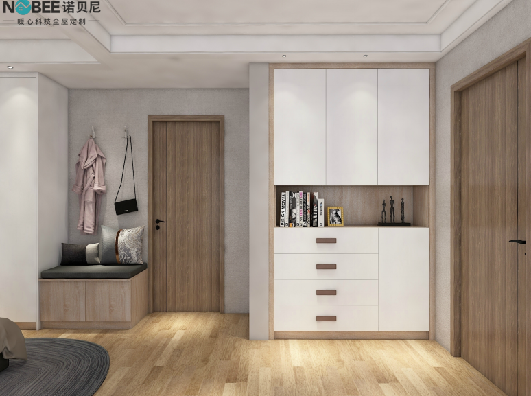 入户空间较小,且房型异型,根据设计方案采用白色哑光系列,整体感觉令人清新自然。格局方面柜子范围内包含了两个电箱,同时根据与业主沟通,对鞋柜的收纳要求是多放鞋。业主夫妻多以休闲舒适鞋类为准,所以对鞋的隔板高度做了精确计算。以多放鞋为原则。按目前的设计计算,该鞋柜可收纳鞋 25-30双。左侧区域以矮柜形式呈现,进出门换鞋方便。侧板位置配置壁挂配件,雨伞,外套整齐归纳。