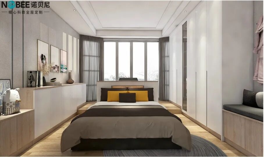 主人房的设计是通过3个组合柜完成。首先衣柜部分因为有台阶,我们通过中间玻璃门的运用做了很好的分隔和过渡。床头柜的功能非常强大。床边柜能够满足多余物品的储存。