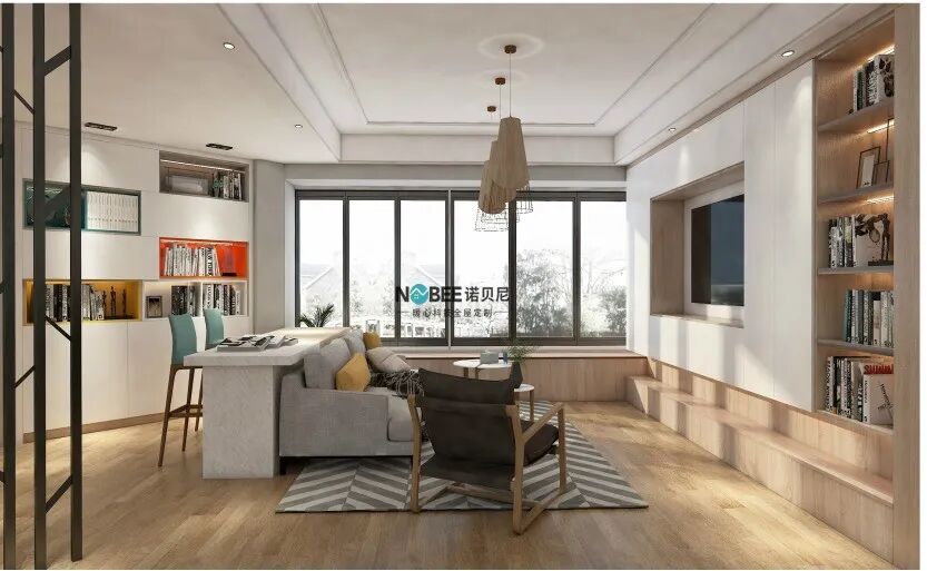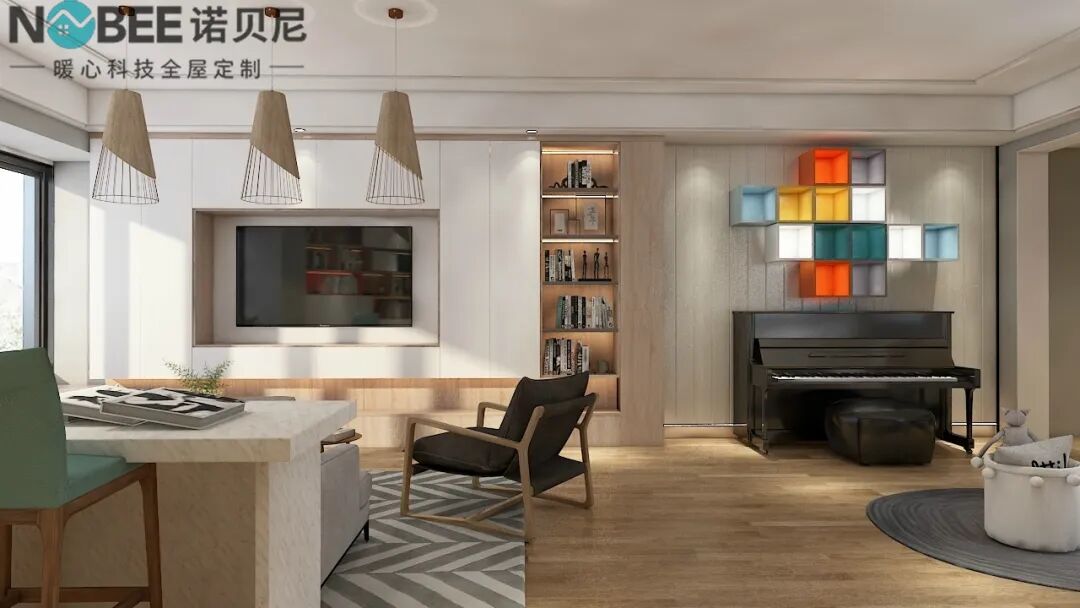 书柜采用半开放设计,对于物品的摆放及收纳非常明确。门板颜色与电视柜门板颜色相呼应,整洁大方。客厅属于斜边型,书柜朝向钢琴区域,我们将柜内柜的颜色与钢琴吊柜“一生所爱”的颜色相呼应。形成完美的配合。
