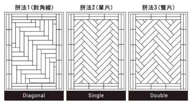 将木板依照“人”字一块一块地拼接起来,这种铺法在视觉会给人很好的感觉。人字形铺法可以细分为三类,分别是:分别是直平人字形、斜人字形、双人字形(如下图)。